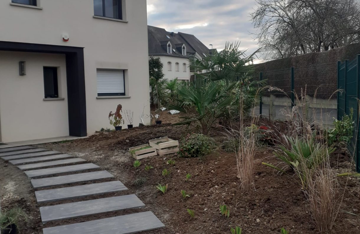 Aménagement d’un jardin comprenant la création de massifs et la réalisation d’un cheminement.
